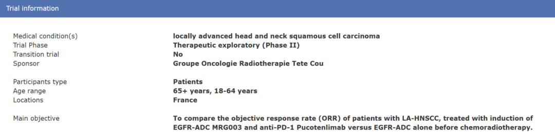 该项研究为全球首个EGFR-ADC联合PD-1单抗针对局晚期头颈鳞癌开展的临床探索。数据显示,大多数头颈癌(90% 至 95%)为头颈鳞癌。约三分之二的患者确诊时为局晚期头颈鳞癌 [1]。多年来,除手术技术和放疗方式的改进外,局晚期头颈鳞癌患者的治疗方案未出现重大革新,仍有许多局晚期头颈鳞癌患者不适合或无法接受肿瘤切除术 [2, 3]。此次研究聚焦在局晚期头颈鳞癌患者,探索 MRG003 单药或联合免疫治疗在晚期一线治疗前的疗效与安全性,通过早期干预,优化治疗策略,旨在为患者争取更好的疾病控制效果,改善疾病预后方面的临床潜力,以期为局晚期头颈鳞癌患者提供全新的治疗选择与临床策略。