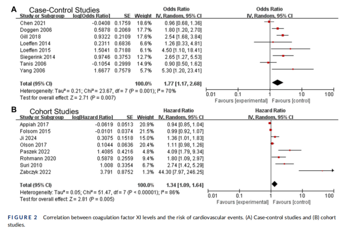 无论是病例对照研究还是证据等级更高的队列研究,其合并分析结果均显示,较高的FXI水平与心血管事件风险的增加显著相关。